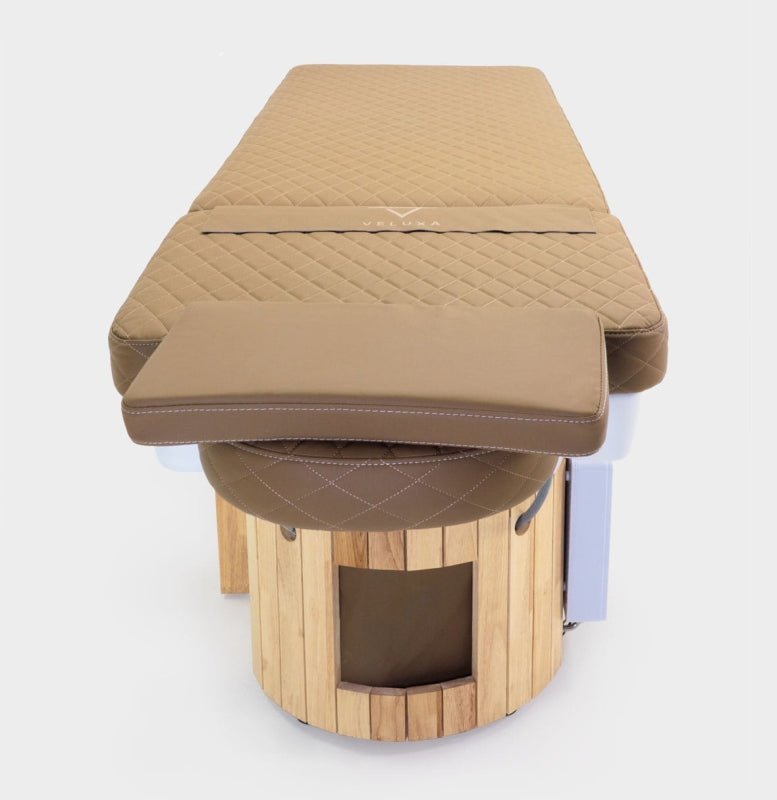 Nowoczesne, wielofunkcyjne łóżko zabiegowe stworzone z myślą o profesjonalnych rytuałach pielęgnacyjnych skóry głowy oraz masażu relaksacyjnym.