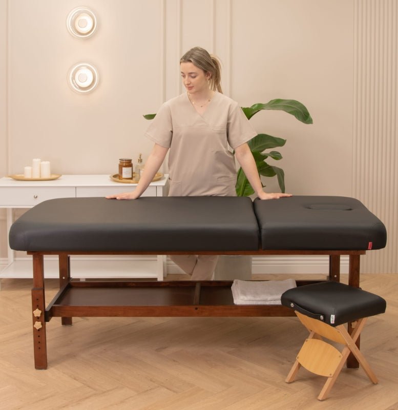 • Stół do masażu stacjonarny drewniany Czarny - Ciemny mahoń