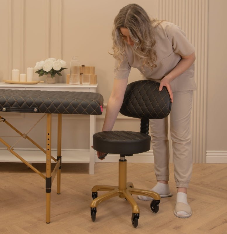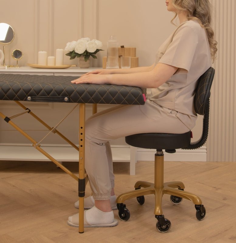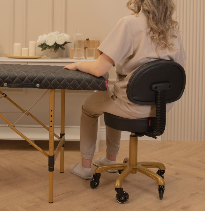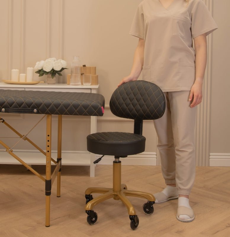 Niezwykle wygodne krzesło kosmetyczne, zapewniające prawidłową postawę ciała osoby siedzącej. Krzesło uposażone w stabilne oparcie, pozwalające odciążyć kręgosłup w każdej wolnej chwili pomiędzy zabiegami. Siedzisko wypełnione grubą warstwą pianki tapicerskiej, pokryte wysokogatunkową ekoskórą z widocznymi obszyciami.  Taboret został wyposażony w zwrotne kółka kauczukowe.
