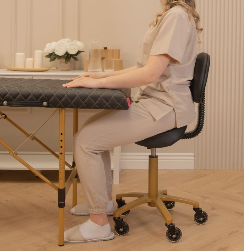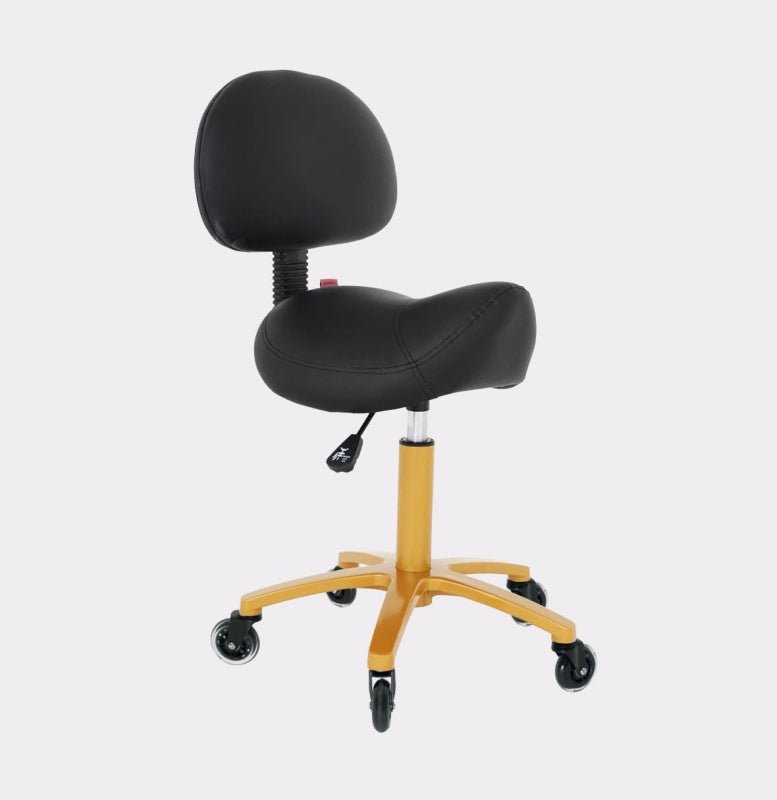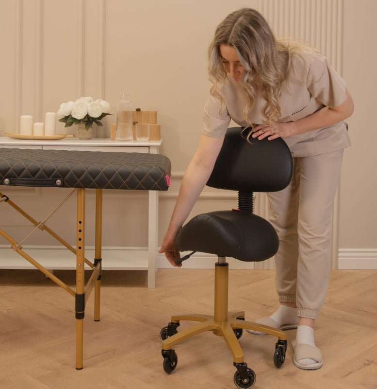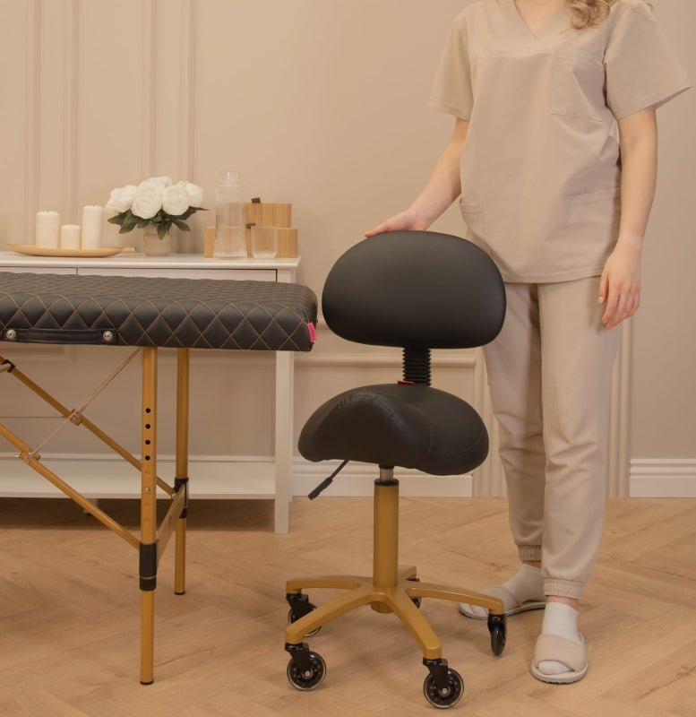 Niezwykle wygodne krzesło kosmetyczne, zapewniające prawidłową postawę ciała osoby siedzącej. Krzesło kosmetyczne z oparciem typu RODEO/SIODŁO to profesjonalny taboret, który łączy wygodę, funkcjonalność i elegancki wygląd. Specjalnie zaprojektowane siedzisko w formie siodła sprzyja utrzymaniu prawidłowej postawy ciała, co jest szczególnie ważne podczas wielogodzinnej pracy w pozycji siedzącej.