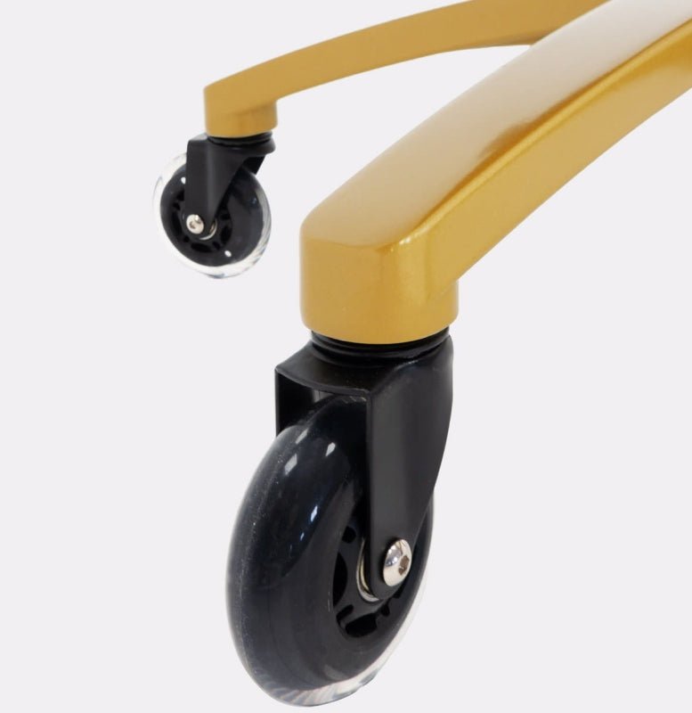 Zwrotne, kauczukowe kółka gwarantują płynne przemieszczanie się bez konieczności wstawania, co zwiększa komfort i ergonomię pracy. Stalowa noga oraz podstawa malowana proszkowo w kolorze złotym dodają całości elegancji, czyniąc krzesło nie tylko praktycznym, ale i stylowym elementem wyposażenia.